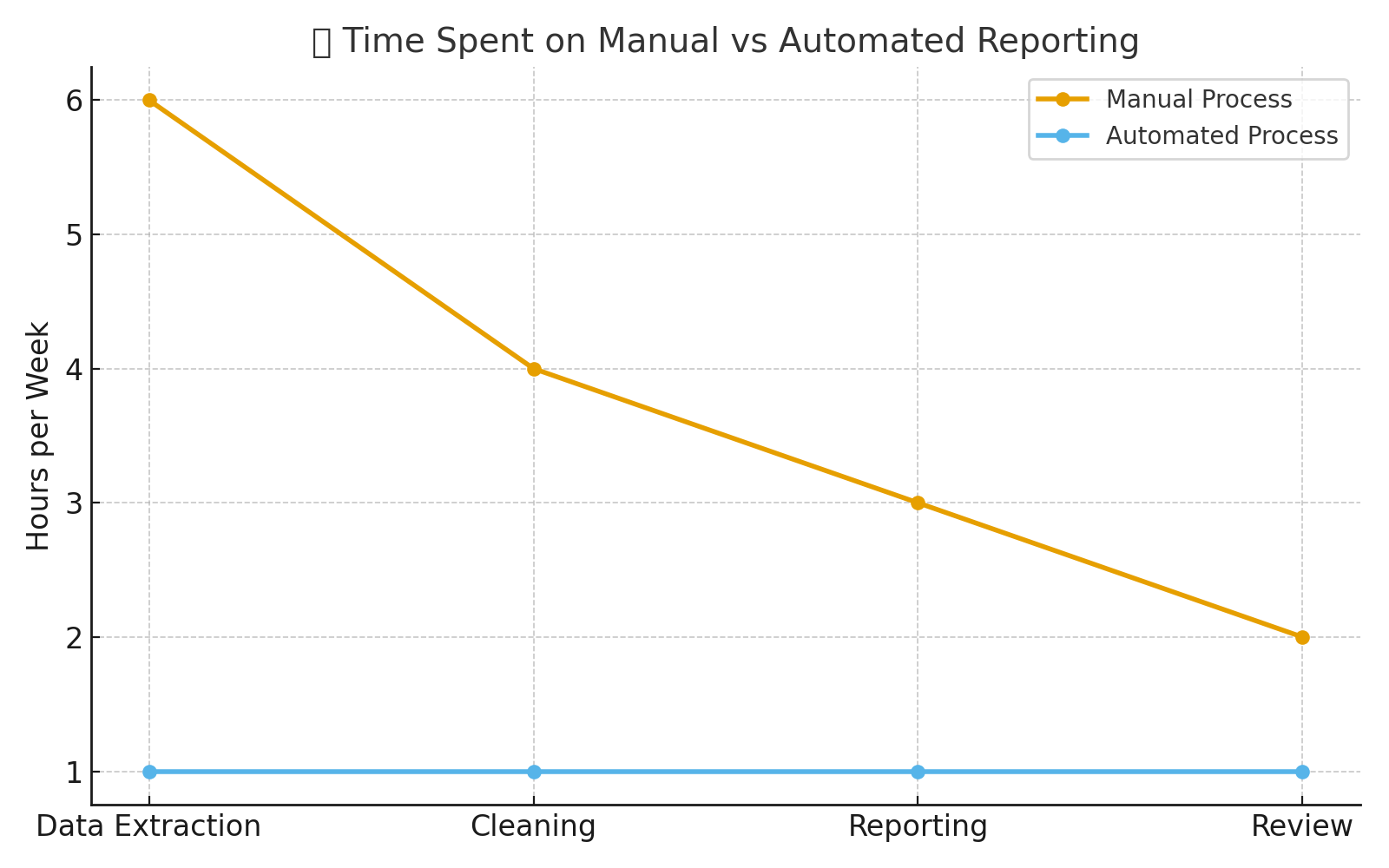 Comparison line chart showing hours spent per reporting phase in manual vs automated systems - manual workflows require 6× more time on data extraction, cleaning, and review.