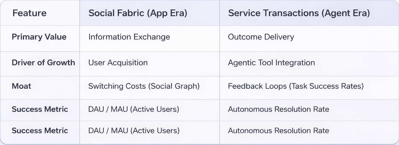 As we pivot into the Agentic Era, network effects are undergoing a structural mutation. We are moving from a model of connectivity to a model of Service Transactions. In this new paradigm, value is not created by how many people you can "reach," but by how many complex, multi-step outcomes an autonomous agent can "deliver."